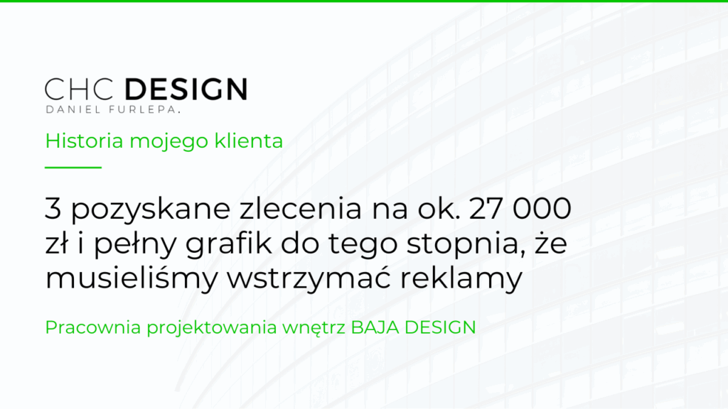 Zobacz wynik na YouTube Wprowadzenie — kim był klient? Agnieszka Michalska — właścicielka pracowni BAJA DESIGN, architekt wnętrz z Gdańska, działający na terenie Trójmiasta. Gdy się do mnie zgłosiła, szukała skutecznego sposobu na pozyskanie nowych zleceń na kompleksowe projekty wnętrz. Tak jak wielu innych architektów, do tej pory polegała głównie na poleceniach — ale chciała […]