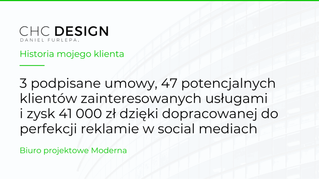 Zobacz wynik na YouTube Wprowadzenie — kim był klient? Grzegorz Ignaciak — właściciel biura projektowego Moderna z Lipnicy Wielkiej (okolice Nowego Targu). Od lat działa w branży projektowej, specjalizując się w domach jednorodzinnych, budynkach gospodarczych, garażach i załatwieniu wszystkich formalności. Gdy zgłosił się do mnie, pozyskiwał klientów wyłącznie z poleceń — a jego celem było […]