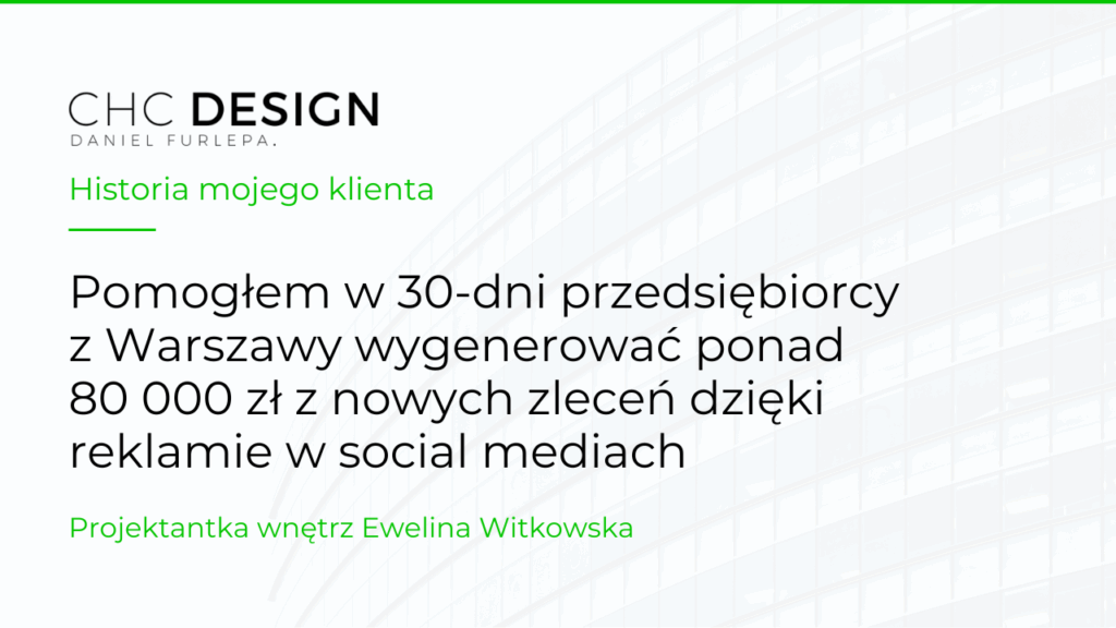 Zobacz wynik na YouTube Wprowadzenie — kim był klient? Ewelina Witkowska to doświadczona projektantka wnętrz działająca w Warszawie. Zgłosiła się do mnie, ponieważ chciała zdobywać więcej dobrych zleceń na kompleksowe projekty wnętrz. Mimo ogromnych kompetencji i portfolio, nigdy wcześniej nie prowadziła kampanii reklamowych. Wszystkie dotychczasowe realizacje zdobywała z poleceń lub przez naturalny ruch w social […]