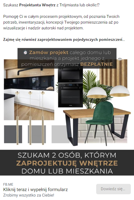 • Dorzuciłem gratisy (np. bezpłatna konsultacja lub projekt jednego z pomieszczeń gratis) — działało jak magnes do wypełnienia formularza.