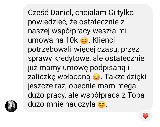 • 1 podpisana umowa o wartości 10 000 zł (klient wpłacił już zaliczkę).