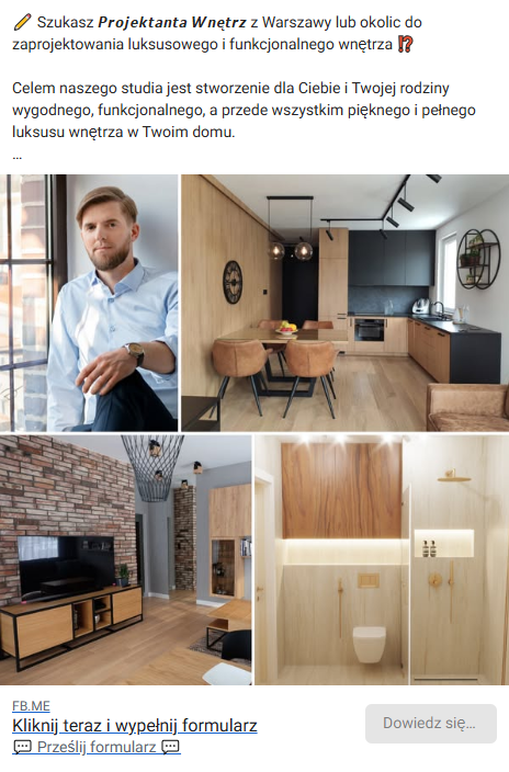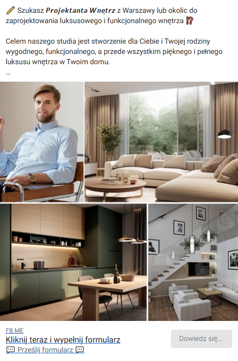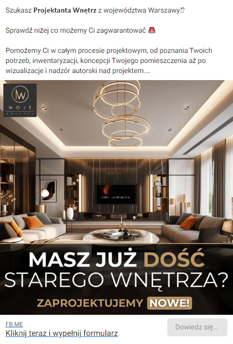 - Przygotowałem kampanię reklamową na Facebooku i Instagramie, skierowaną do osób z Warszawy i okolic, które szukają luksusowego, funkcjonalnego projektu wnętrza.