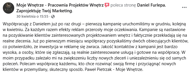 Paweł chciał dotrzeć do nowych klientów spoza poleceń i zbudować solidne źródło zapytań przez social media, które realnie przekłada się na zlecenia na usługę projektowania wnętrz.