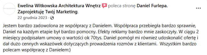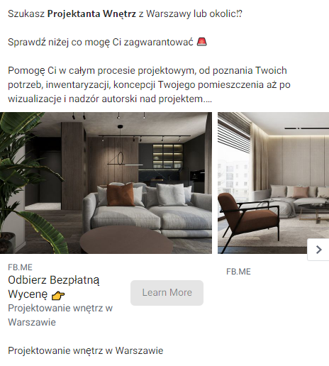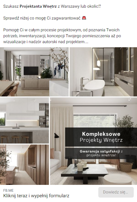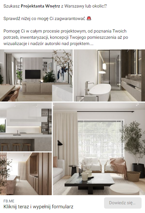 - Stworzyłem strategię reklamową dopasowaną do grupy docelowej — osób szukających projektanta wnętrz do zaprojektowania mieszkania lub domu.